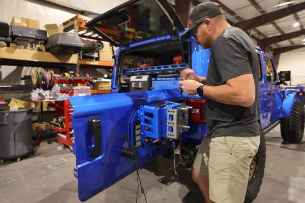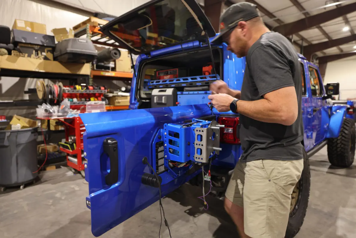 This mount positions the compressor behind the spare tire on the outside of the tailgate, keeping it out of the way yet easily accessible.