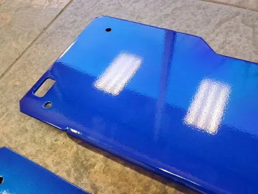 Powder coat choices with a two coat process will yield slightly more protection than the single coat processes just due to thickness. Textured colors are perceived as more durable because they are better suited to disguise chips and nicks (ie. Inner Fenders) than your Satin or Gloss coatings. Gloss is the hardest coating to make perfect. Any debri caught in the process will show due to the high level of reflection.