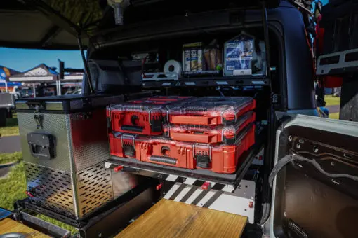Powder coating is a manual process done by humans and may take some time. When you purchase powder coated products from AAL, we coat them for your order. Occasionally, that means delays with non-standard colors, resprays for less-than-perfect conditions, etc. We have a very high standard with powder coated products. We will work to get your parts coated in the best condition possible before they leave the building. Please visit our Powder Coating Page for more info. If you’re looking to maximize the flexibility of your refrigerator mounting solution or are looking to add extra table space on top of our MASS drawers, our Flat Slides may be just what you’re looking for. The key differentiator for this line of slides is that we lay the slides on their side, allowing for a completely flat mounting surface above the slides. In terms of mounting a refrigerator, this allows the fridge to spill over the edges of the slides, opening up your cargo space to a much broader selection of refrigerators. In the cargo management world, everything is a tradeoff. So here’s the tradeoff with the flat slide – with the slides mounted in their “flat” orientation, the load rating is reduced to 250#, down from 500# when mounted vertically. Dimensions:- Platform Width: 20.5″ (444.5mm)