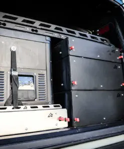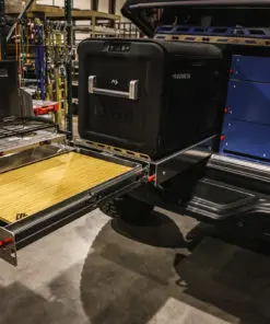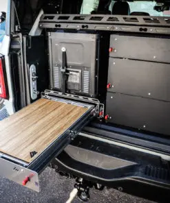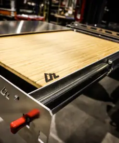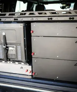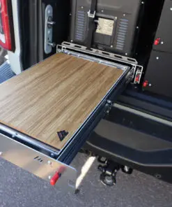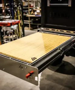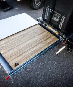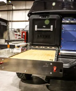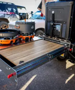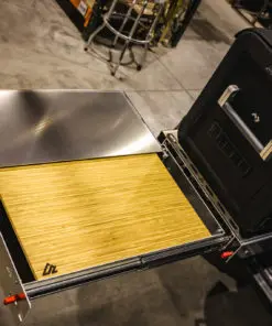 This is our new Bronco Flip’n Slide Drawer! This version does not have a support leg like our current JL Flip’n Slide version. You can just pull it out and you’re ready to start cooking! This has a removable bamboo table surface which makes it easy to take out and clean or use as a serving tray. The Bronco being a bit wider than the Jeep JL makes it so that we can fit a camp stove on top of the Flip’n Slide Drawer giving you all the room you need for that outdoor cooking. With the wood being removable you are able to store things underneath like plates/utensils etc.Dimensions