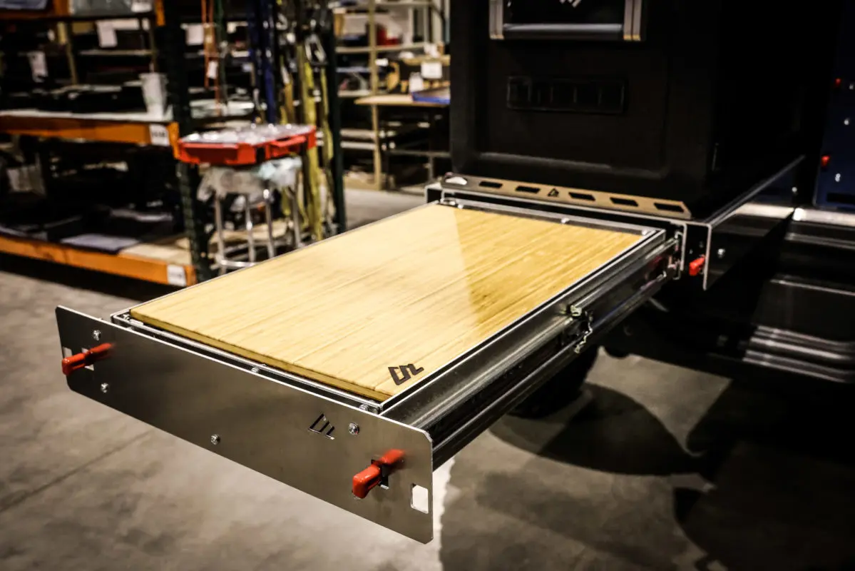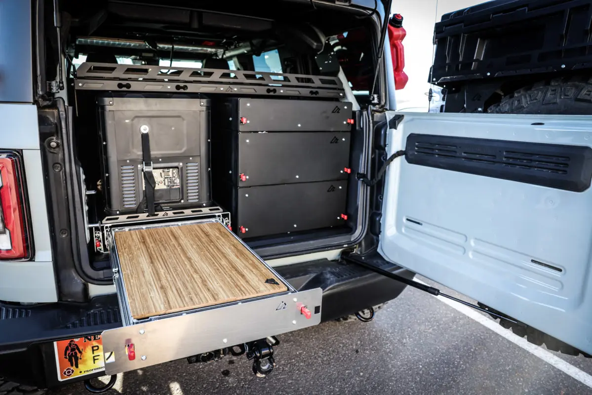 This is our new Bronco Flip’n Slide Drawer! This version does not have a support leg like our current JL Flip’n Slide version. You can just pull it out and you’re ready to start cooking! This has a removable bamboo table surface which makes it easy to take out and clean or use as a serving tray. The Bronco being a bit wider than the Jeep JL makes it so that we can fit a camp stove on top of the Flip’n Slide Drawer giving you all the room you need for that outdoor cooking. With the wood being removable you are able to store things underneath like plates/utensils etc.Dimensions