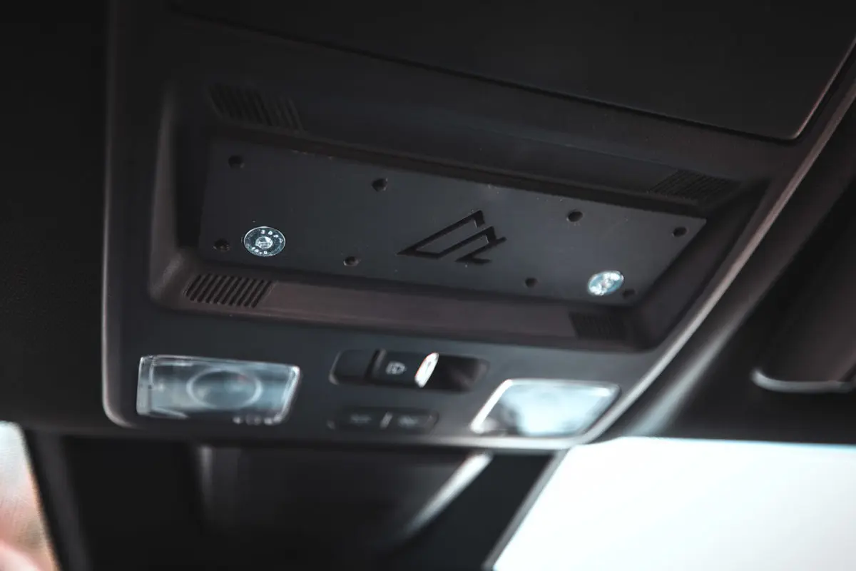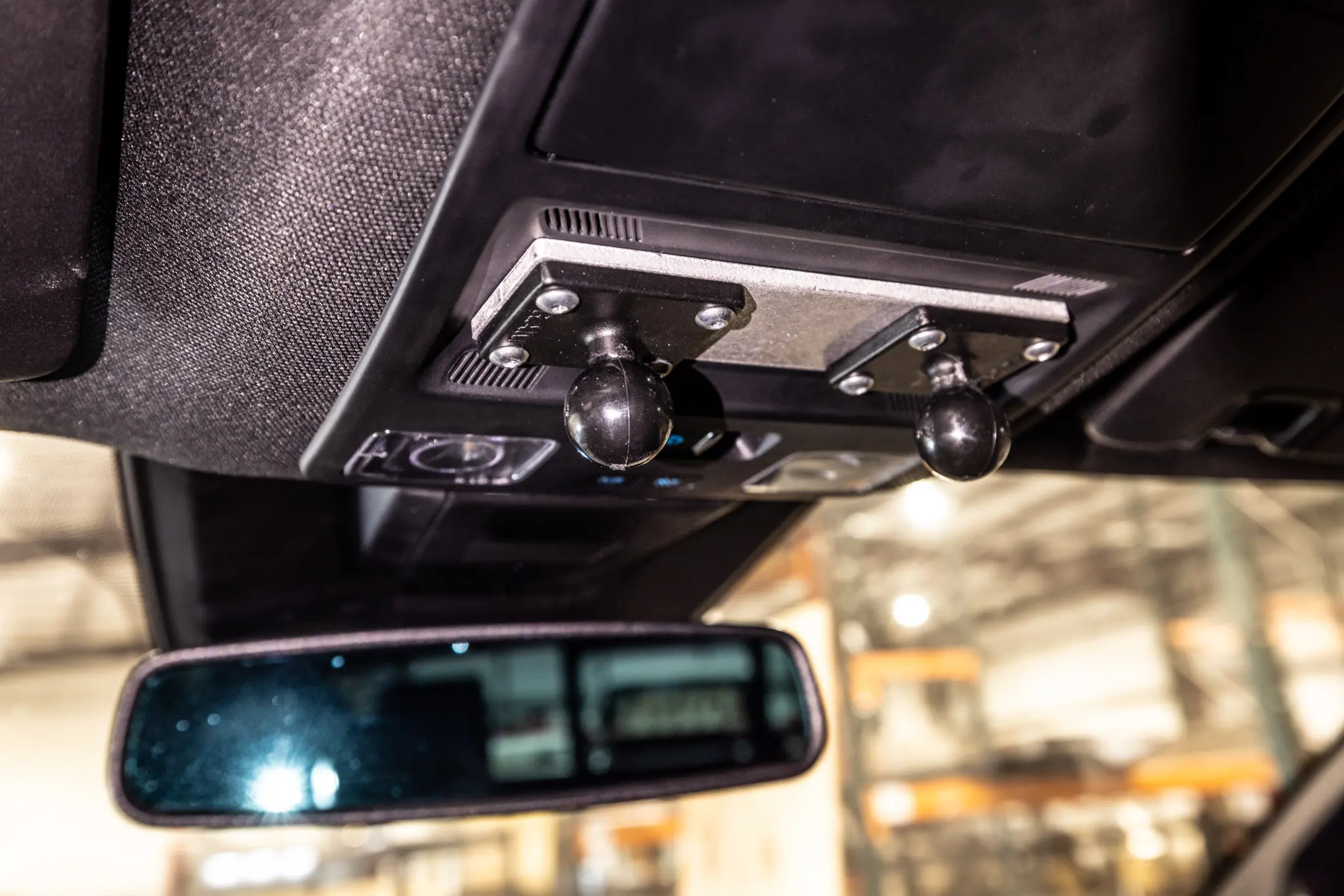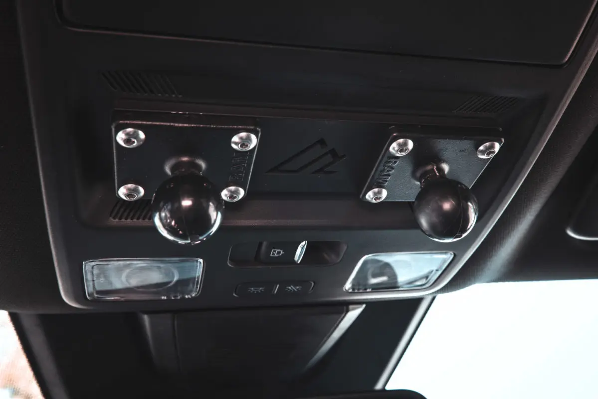 This bracket installs above the overhead console and gives you two clean, strong mounting points (metric M6 threads) that pass through the factory console via two small drilled holes.
