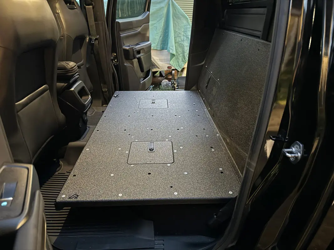 Built for commercial, utility, and military-grade use, our 6th Gen Ford Ranger Rear Seat Delete transforms your rear seat area into a flat, waterproof, easy-to-clean platform. Made from 5052 aluminum with a 3mm steel support structure, it’s strong enough for heavy gear or large dog crates but only slightly heavier than the factory seats. Features include removable access doors for factory cubbies and the OEM jack, compatibility with subwoofer-equipped Rangers, tons of tie-down points, and an optional rear wall for MOLLE panels or Packout boxes.