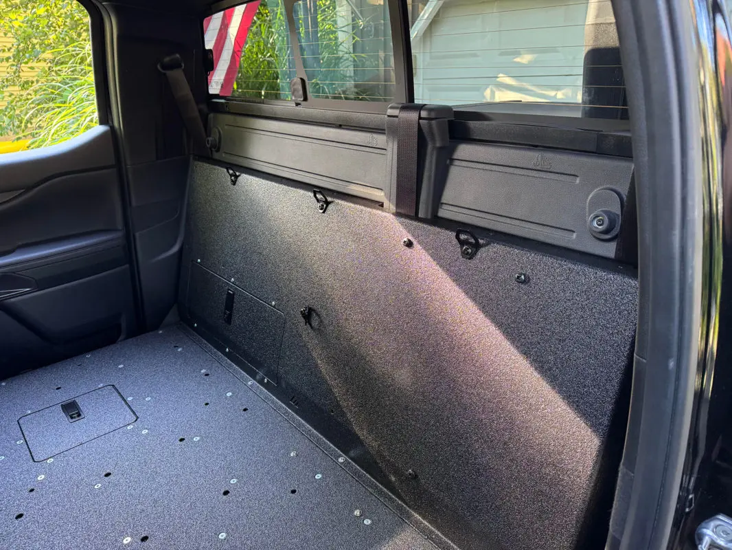 Add the optional rear wall to cover the exposed cab wall and gain a secure mounting surface for MOLLE panels, Milwaukee Packout boxes, radios, or anything else your job (or weekend) calls for.