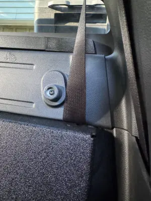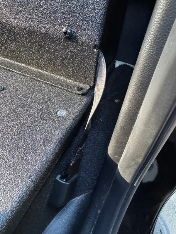 Reconnect the seat belt’s wiring harness after seat removal to prevent dash warnings. The seat belts can be tucked behind the rear wall to keep them out of the way.