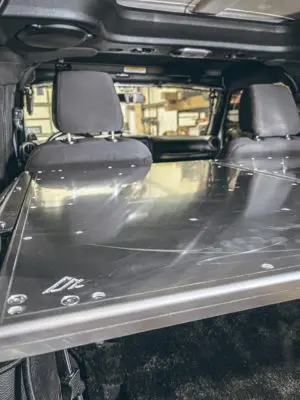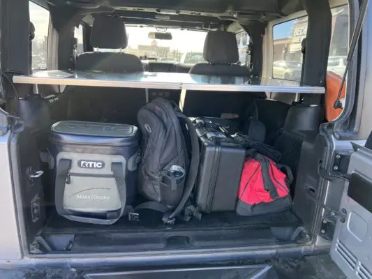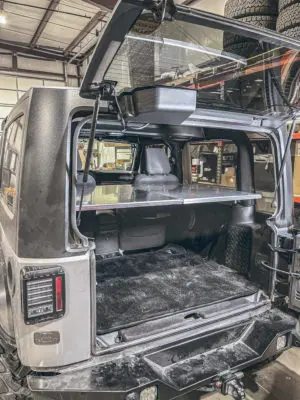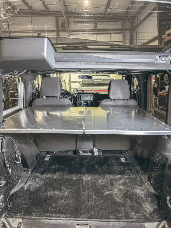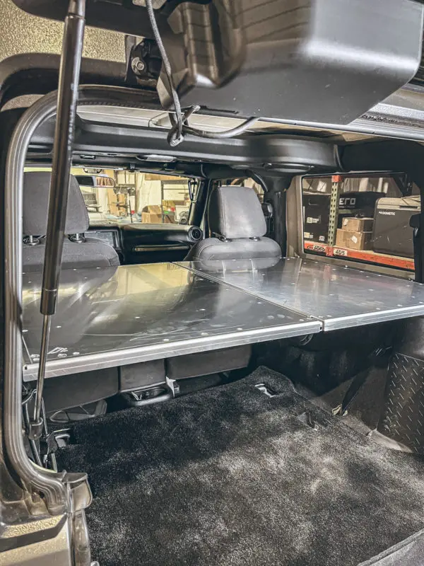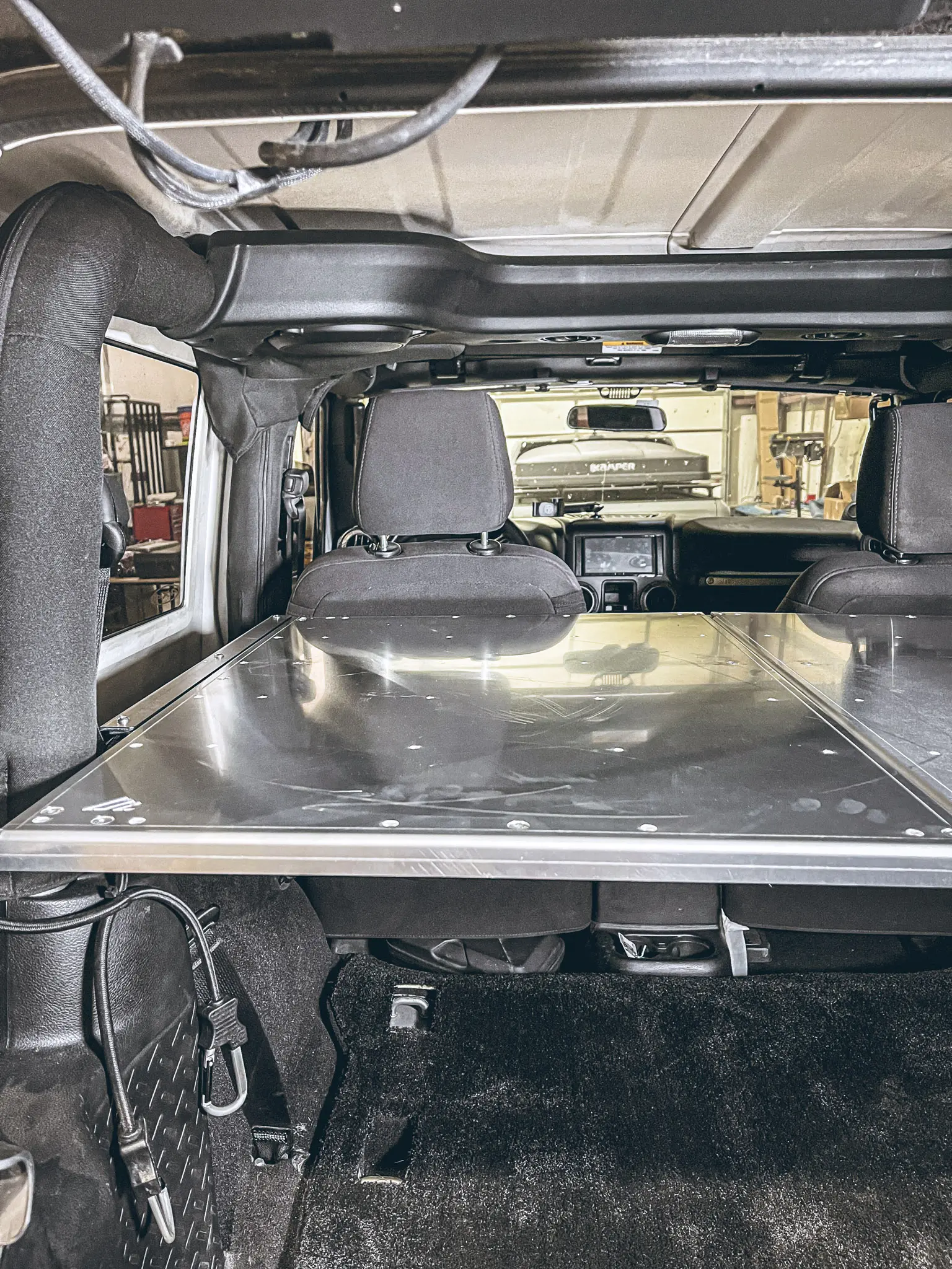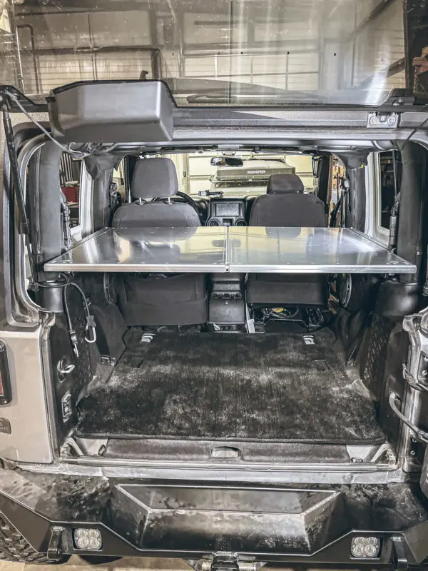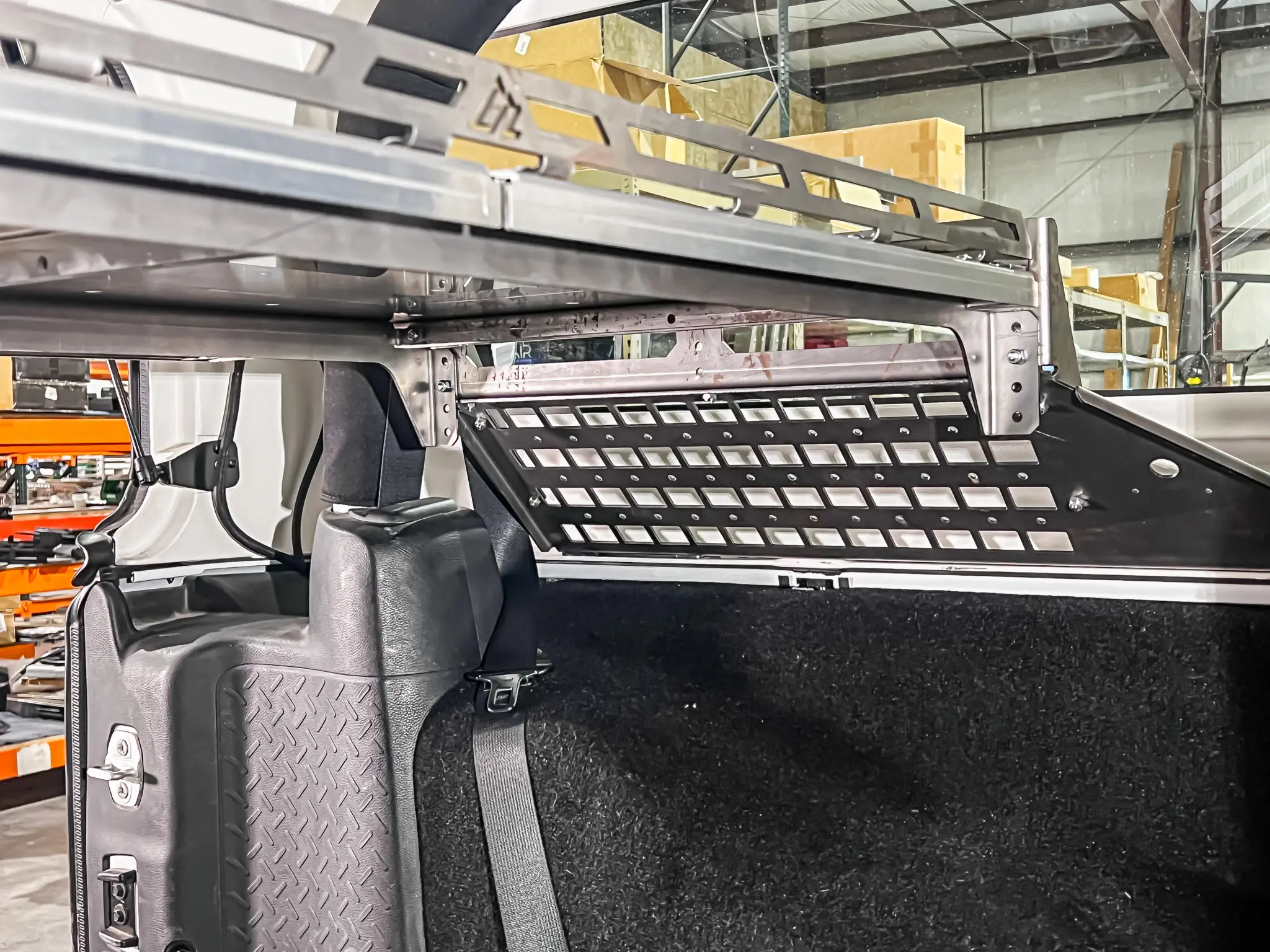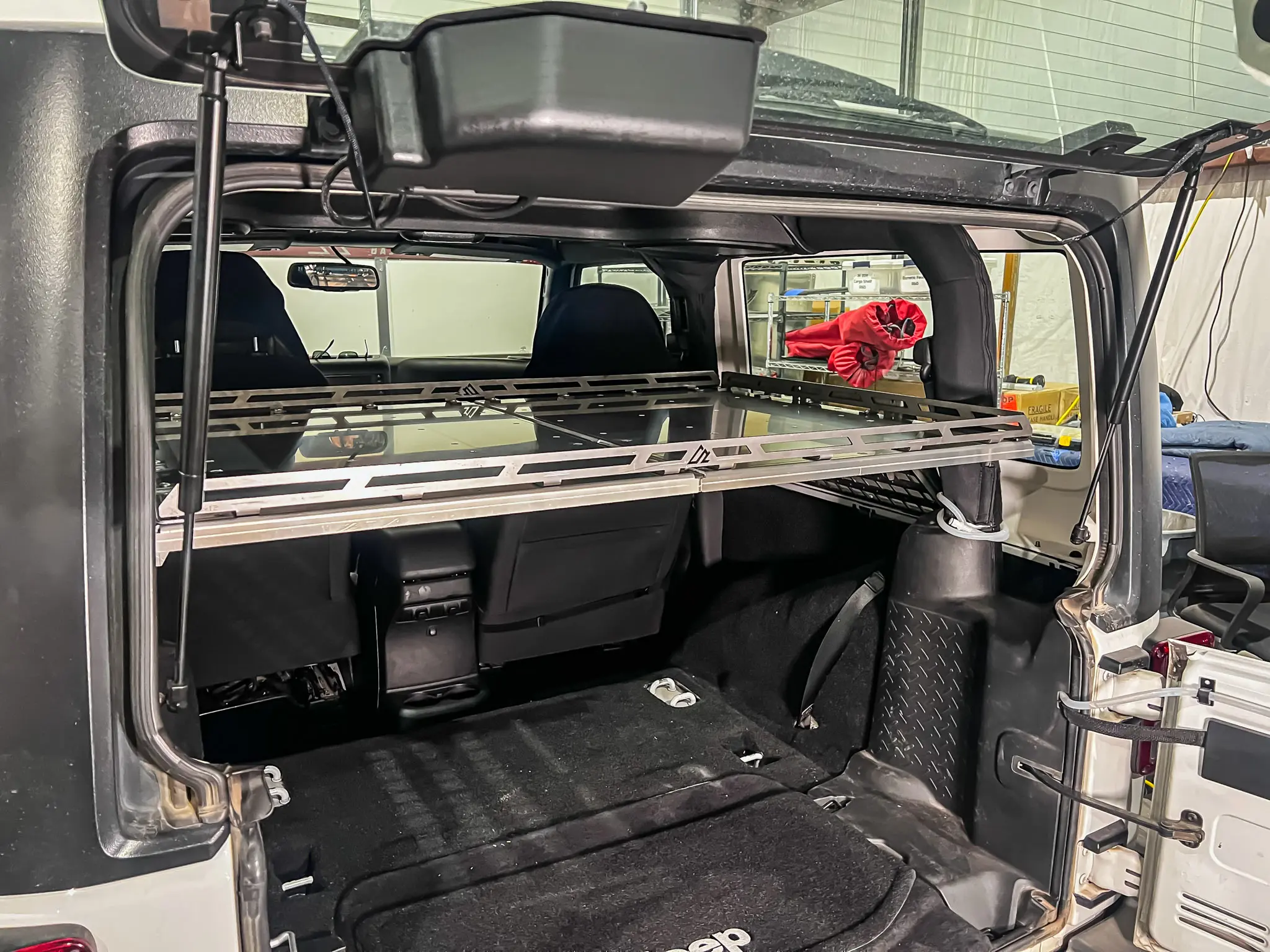 Developed on our shop Jeeps across Southern Utah and high-country trails, this shelf eliminates wasted space and reduces rattle. The structure anchors at robust factory points for a stable platform that stays quiet and solid on rough terrain.Specifications