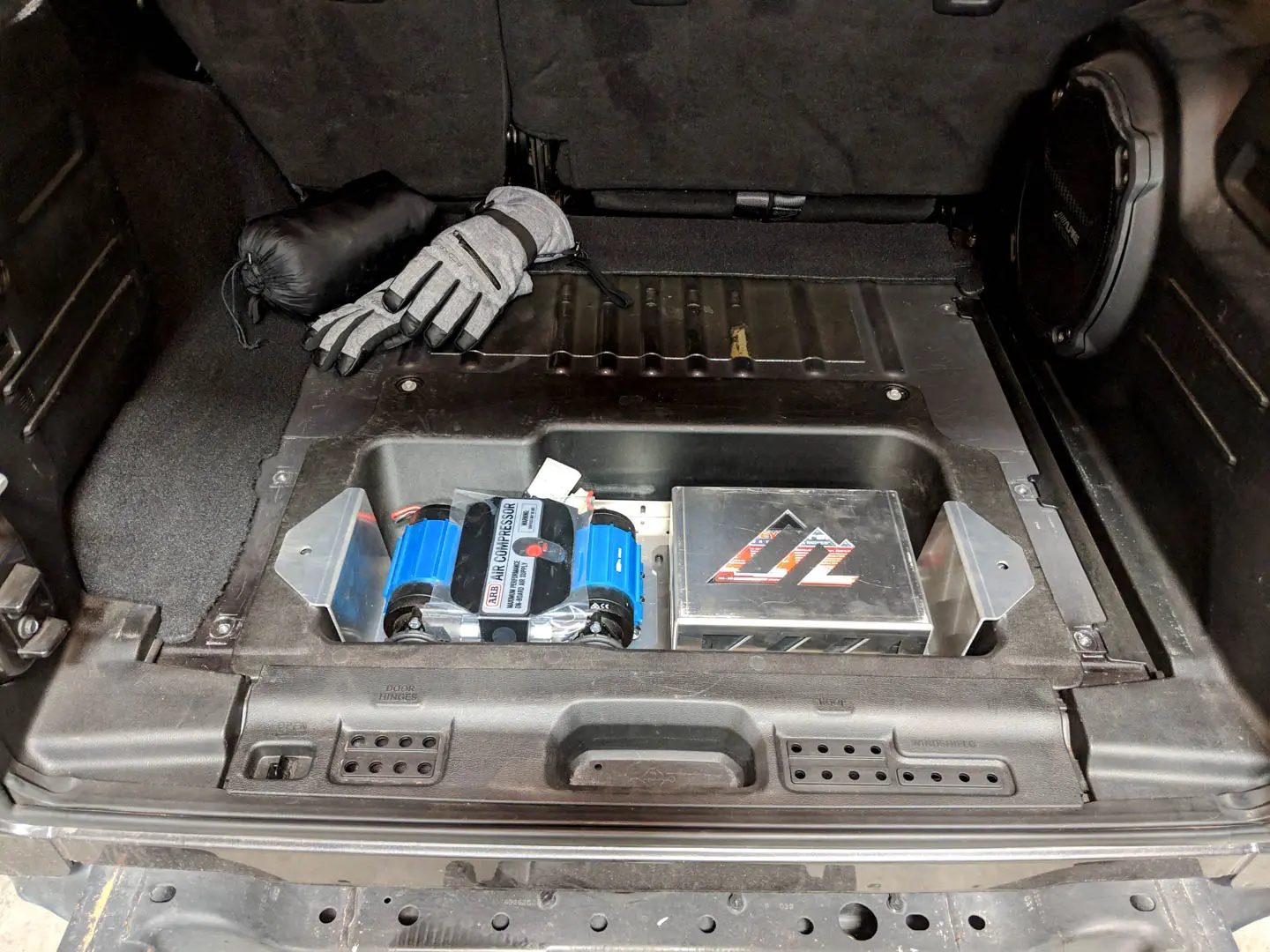 Due to the configuration of the under-the-hood components of the new Jeep JL, there is no longer room to mount a Dual ARB air compressor. Our solution to that problem is to mount the Dual ARB Compressor in the sealed compartment below the cargo area. This has the following benefits: