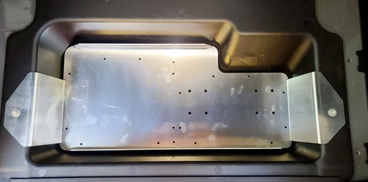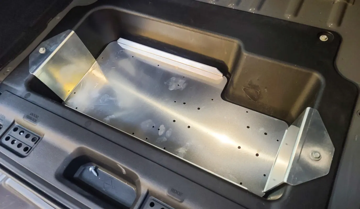 The tray is held into the cargo compartment of the Jeep JL using two OEM bolts and existing threaded holes. No drilling is required to mount this bracket.