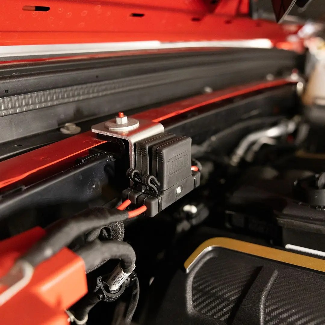 This works on the 392 if you are running the power across the cowl. It also works on the fender next to the battery, upside down, using an unused fender bolt hole and a fender screw that fits there. Hood still closes and clears if you mount the fuses upside down. I drilled a second hole in the mount, near the bend, so the fuses sit right side up.