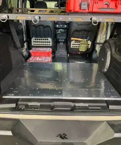 This is the main component of our Jeep JL overland product line. This is the base platform to our M.A.S.S. system. It is made out of 1/8″ 5052 aluminum and is laser cut for extreme precision. We hold a repeatable .005″ tolerance on all cuts for this platform.