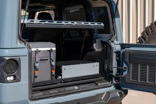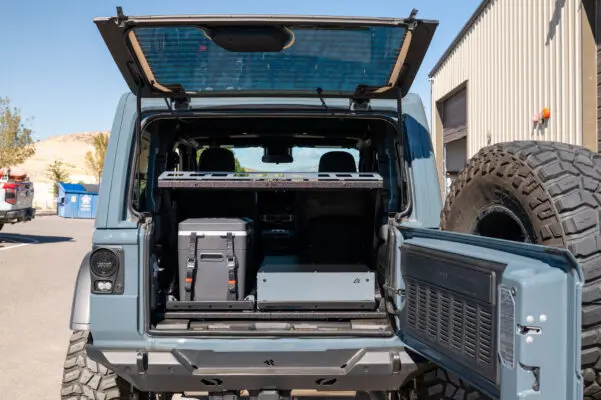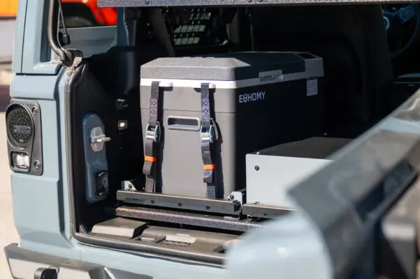 We pair a 14″ narrow slider – ideal for a compact fridge or quick-access gear – with a 19″ wide storage drawer for tools, recovery gear, and essentials. In a 2-door, there is less room for people, so you do not need as much refrigerator. Trade a little cooling capacity for the one thing every overlander needs more of – secure, usable storage.