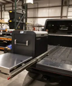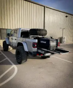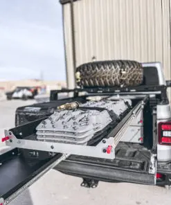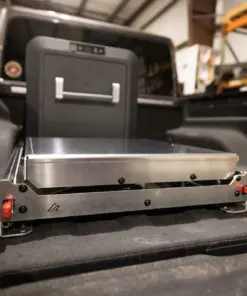 Uses lifetime warranty drawer slides rated at 500lbs. For all of you Jeep Gladiator overlanders, here is the fridge slide that you need to conveniently have a fridge that you can get to without having to jump up into the bed of your truck. This can also double as a cargo slide that you can put above your drawers to mount MaxTrax, Redbox mounting plates, or any other gear/luggage you may have.