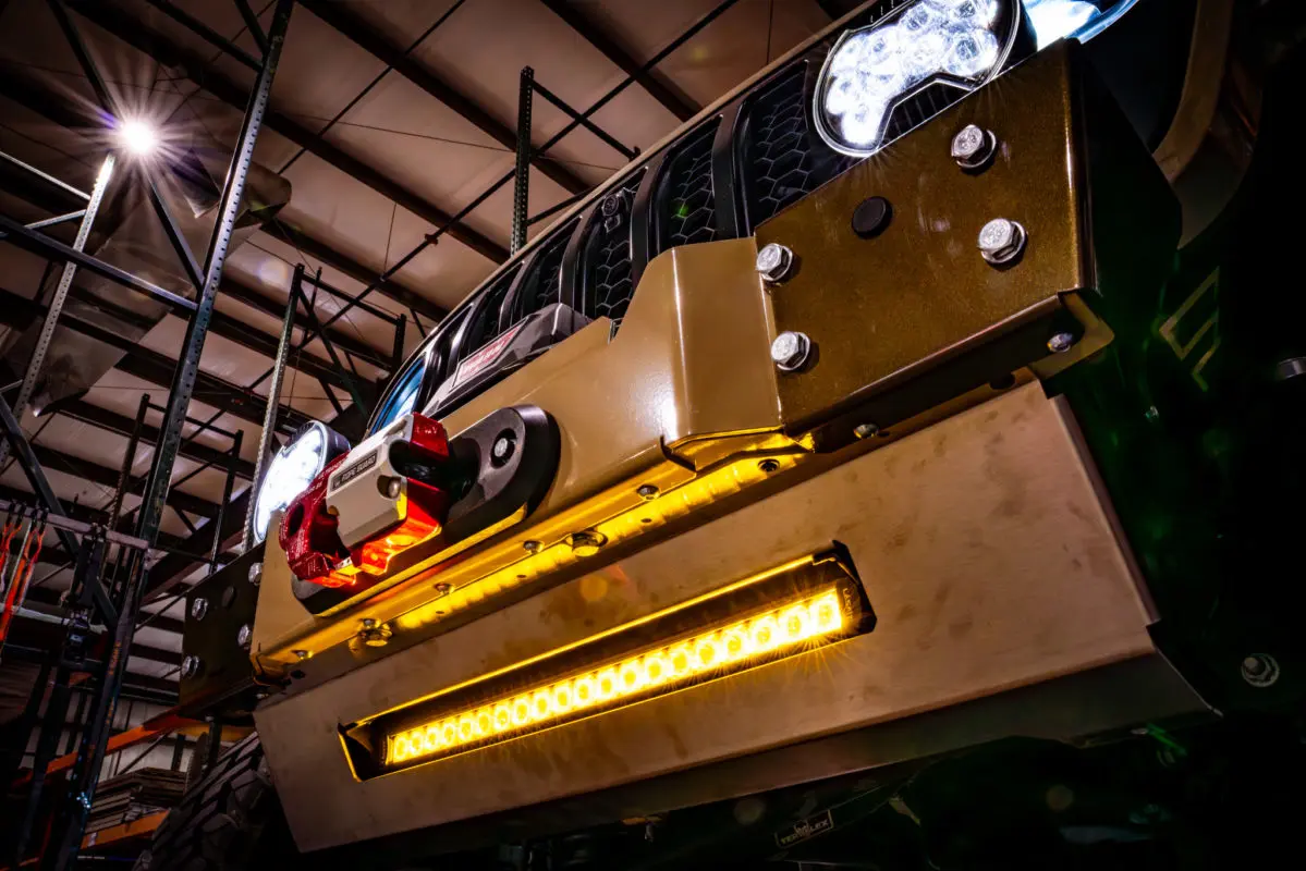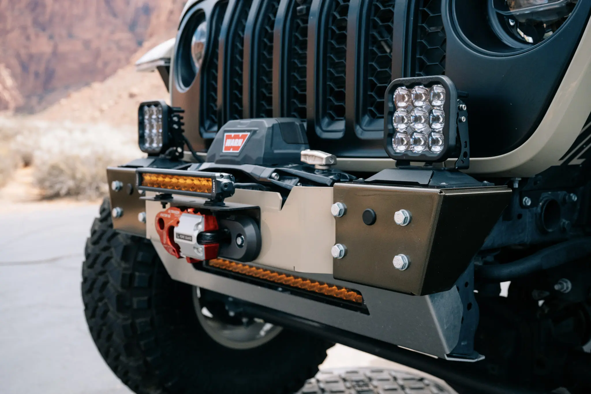 The true value of this bumper system lies in its modularity. Its design allows for quick and easy replacement in the event of damage, as well as seamless upgrades as new options become available. This ensures your bumper evolves with your needs over time, providing long-lasting versatility and value. We’re actively developing a range of options, including built-in lighting solutions and various end cap styles. Best of all, these components can be swapped out effortlessly—without the need to remove the bumper or winch—making customization and maintenance hassle-free. The current version, named “Alpha”, is pictured to the right. It is the minimalistic version of our end caps and is the only available option currently.Photo Gallery