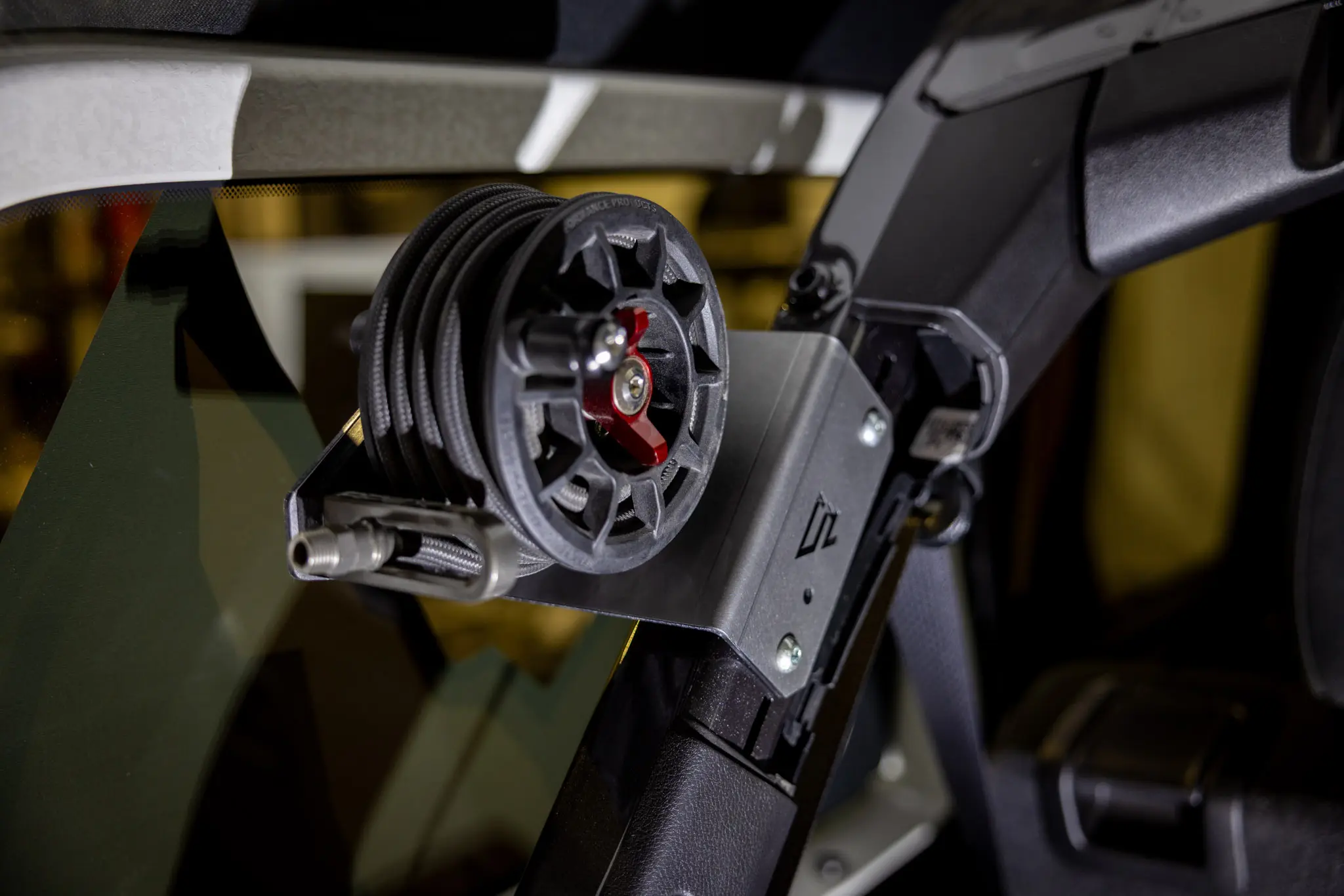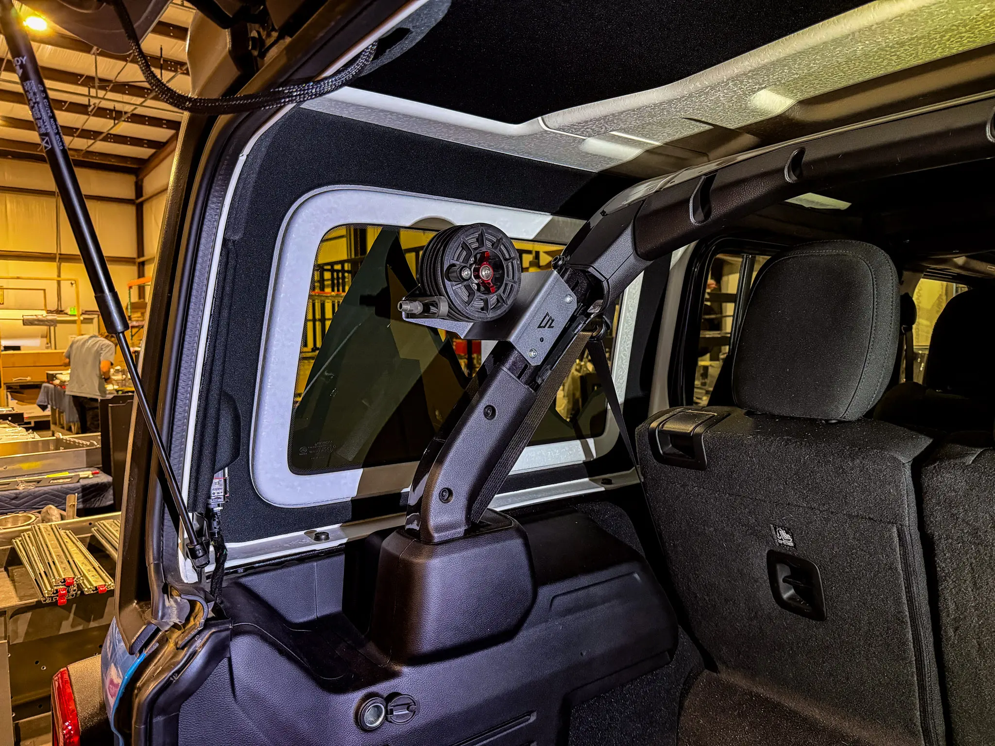 The Apex CRS Fixed Mount for the Jeep Wrangler JLU is a purpose-built solution for mounting your Apex CRS hose reel securely to the driver-side C-pillar while preserving maximum cargo space. This is the only mount on the market that offsets the reel outboard of the C-pillar, creating additional clearance for cargo systems and improving overall interior usability.