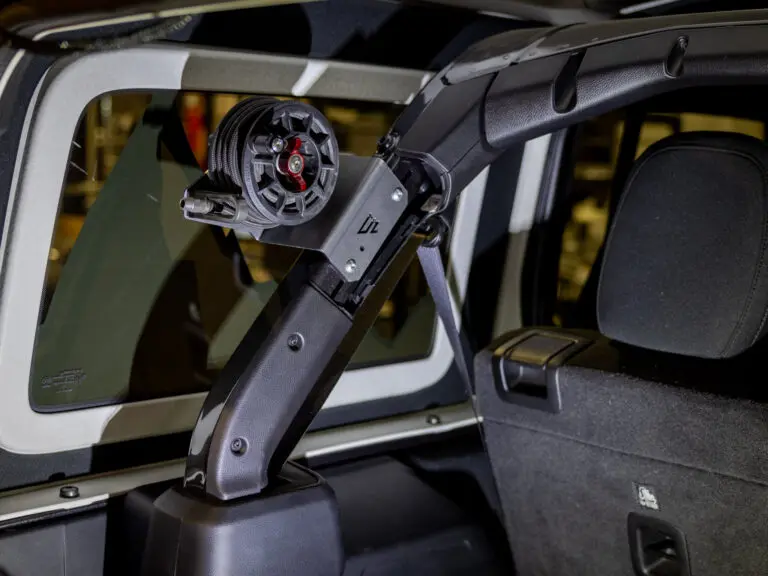 This design keeps the reel tucked tight to the vehicle while avoiding interference with rear storage systems.