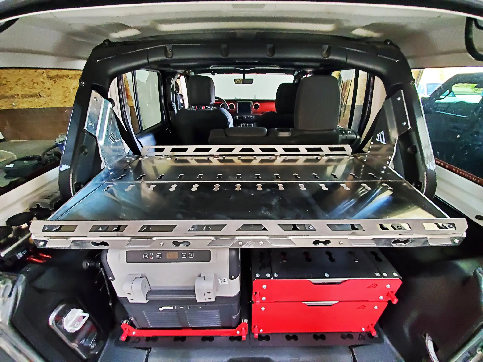 The ultimate overland storage setup for the Jeep Wrangler JLU — combining MASS+ Platform, Flip’n Slide, (2) 6″ Cargo Drawers, (1) 4″ Cargo Drawer, VersaTable Tailgate Table, and a MASS Cargo Shelf for a fully integrated expedition build. Serious performance for serious explorers.