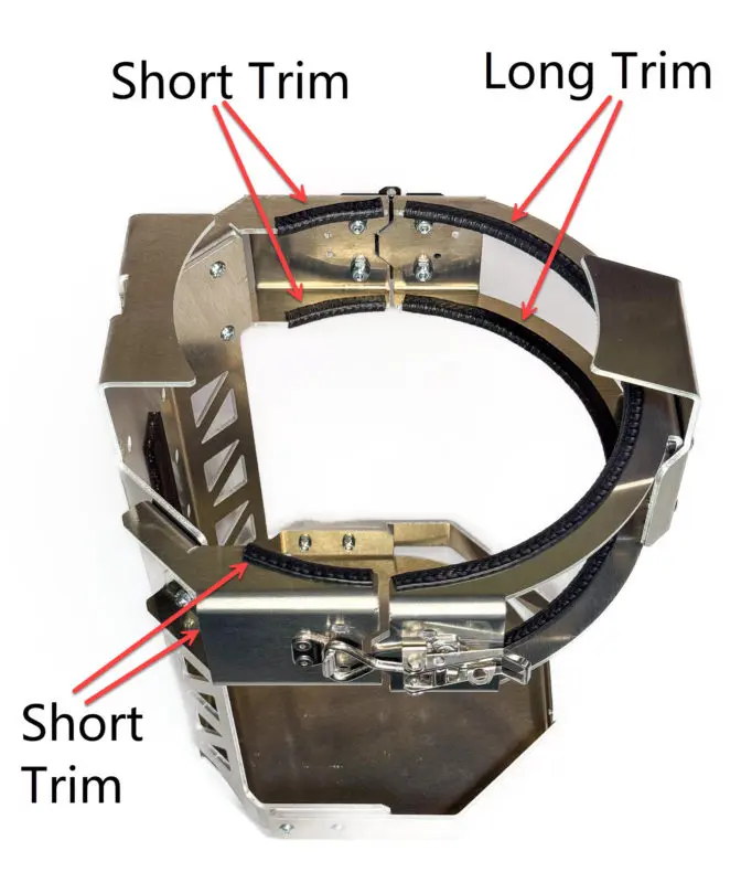 Your bottle mount will ship without the edge trim installed. Install as illustrated here for proper bottle tension. Note: the long trim pieces should start at the very edge of the clamp (near either end). If you don’t start right at the edge, it will be too long by the time you work around the clamp. Trim Included:- (2) Long Pieces