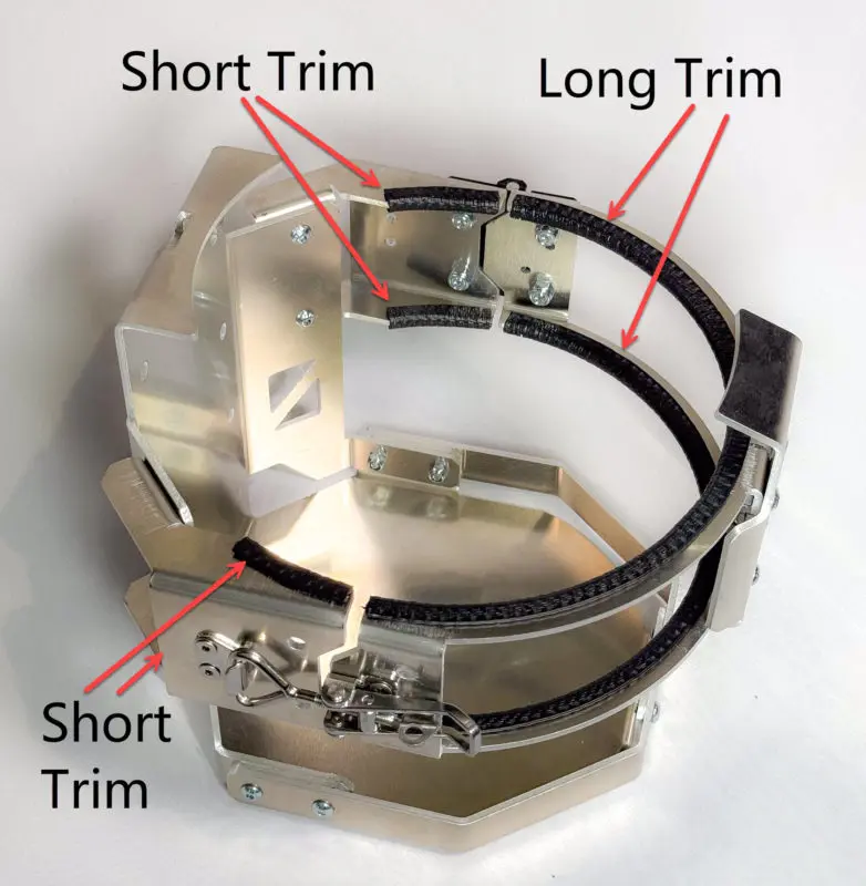 Your bottle mount will ship without the edge trim installed. Install as illustrated here for proper bottle tension. Note: the long trim pieces should start at the very edge of the clamp (near either end). If you don’t start right at the edge, it will be too long by the time you work around the clamp. Trim Included:- (2) Long Pieces