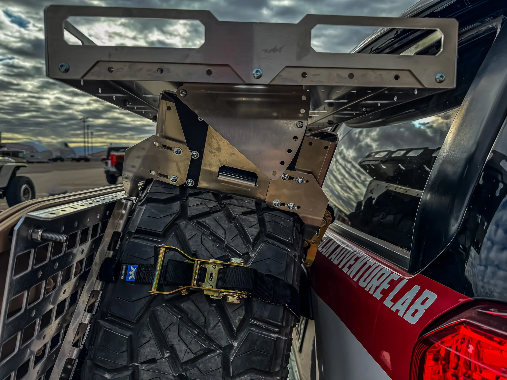 NOTE: This shelf is designed to handle weights up to 100lbs evenly dispersed over the entire platform. However, this is highly dependent on the mounting method for your spare tire. To achieve maximum weight capability, it is important that your tire be mounted to a sturdy swing out tire carrier (not directly to the tailgate).