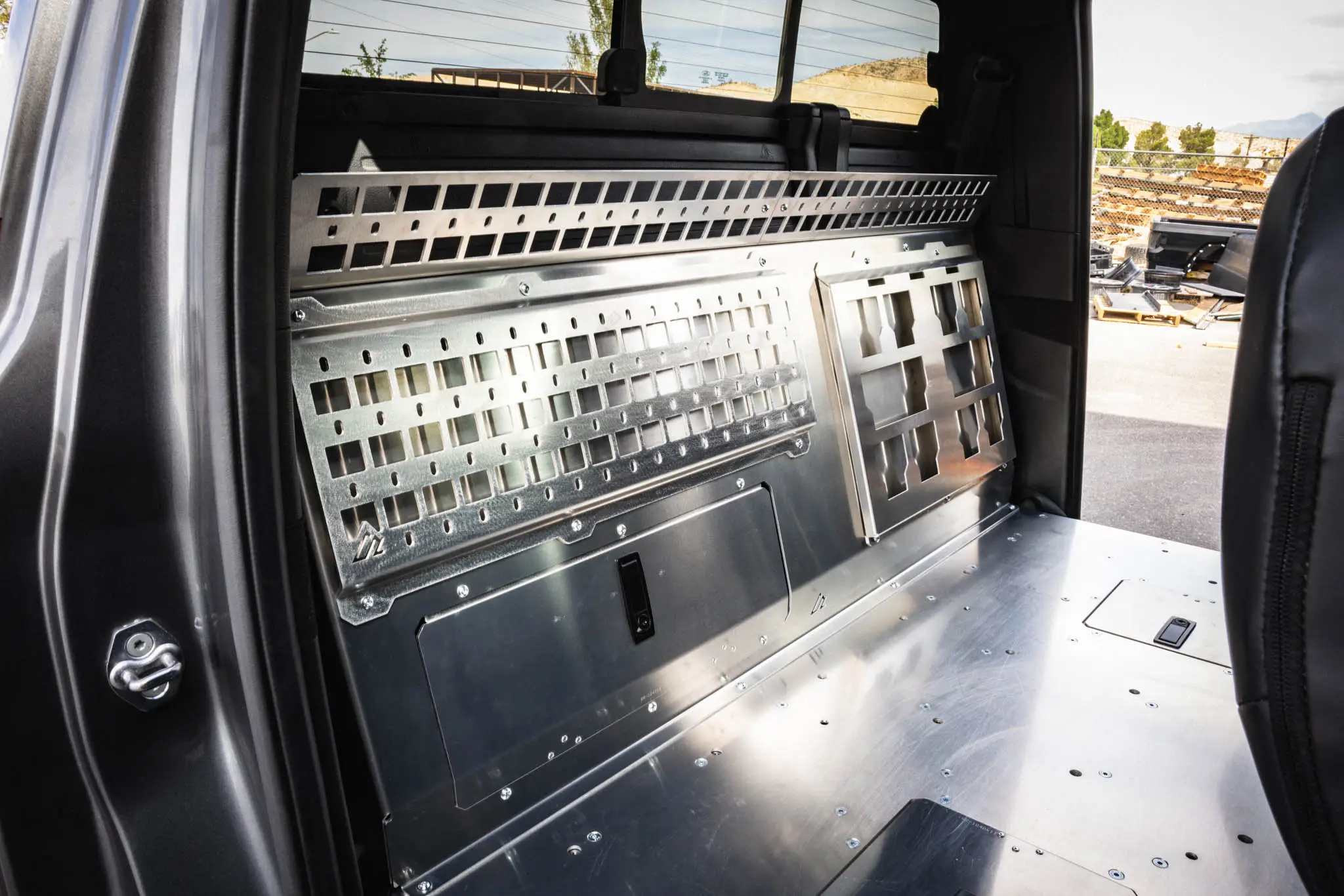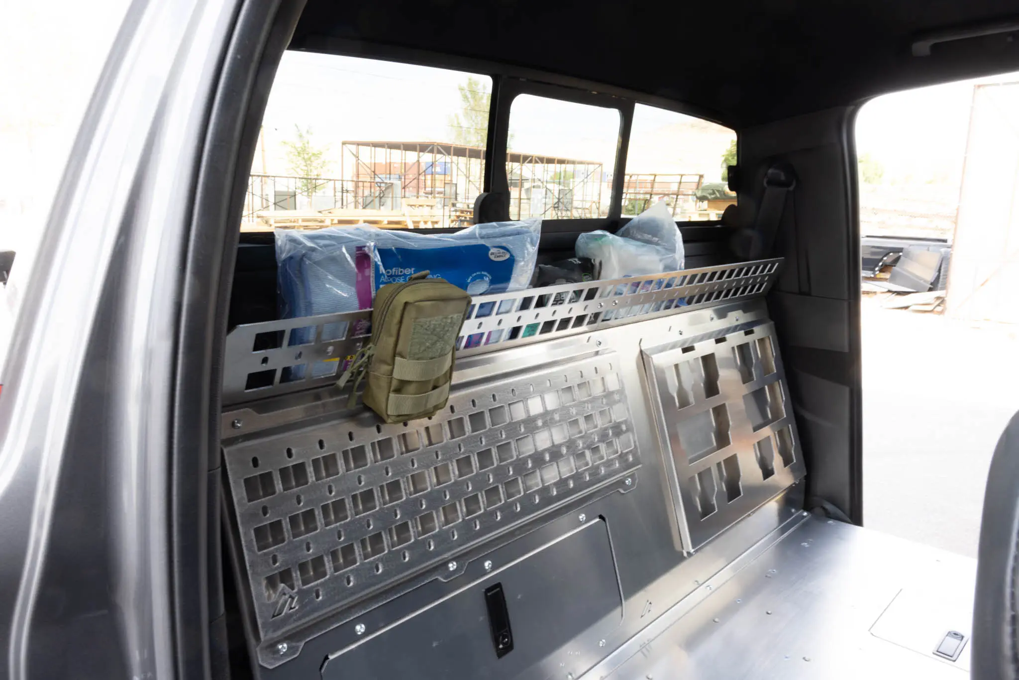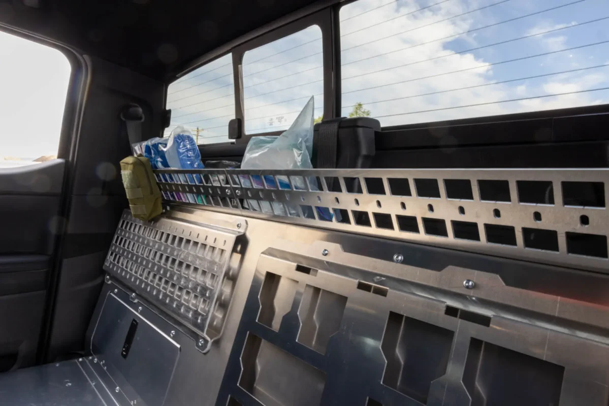 Meet the perfect add-on for your Ford Ranger Rear Seat Delete. The Upper MOLLE Shelf adds a compact but incredibly useful storage zone above the back wall, giving you a clean place to stash soft goods or mount essential gear. This isn’t a standalone panel – it’s a purpose-built expansion for the Rear Seat Delete system, designed to boost organization without taking up valuable floor space.